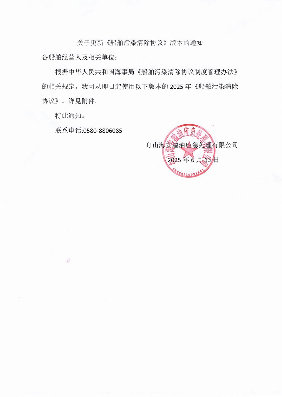 关于更新《船舶污染清除协议》、《污染清除作业方案》等版本的通知