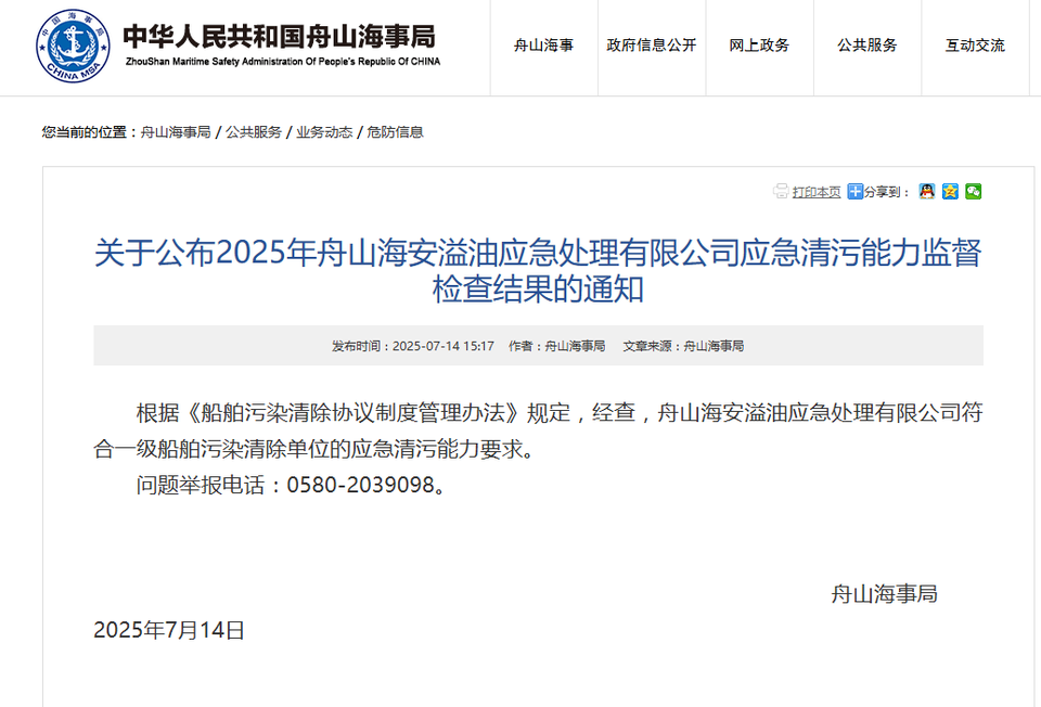 我司符合一级船舶污染清除单位的应急清污能力要求的通知